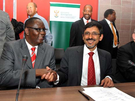 Minister Ebrahim Patel shaking hands with COSATU General Secretary Zwelinzima Vavi during the Local Procurement Accord signing between Business, Unions...