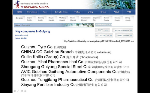 Key companies in Guiyang chinadaily.com.cn, 2013-07-09 Guizhou Tyre Co 贵州轮胎 CHINALCO Guizhou Branch 中铝贵州分公司 Guilin Kailin (Group) Co 贵州开磷 Guizhou...