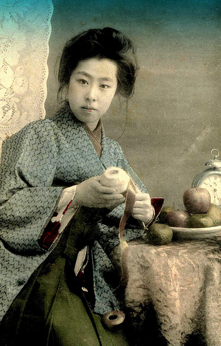 Astute observer and sharp-as-a-whip comment-poster dschinny2001 (see comments below) caught the fact that the negative for this picture was REVERSED before printing. Her Kimono — and the clock as well — tell the story, as both are BACKWARDS. (Since the Japanese are the ones that printed it, I ascribe the gross error to the darkroom guy having been out drinking sake all night with his friends, and cavorting with Geisha Girls).